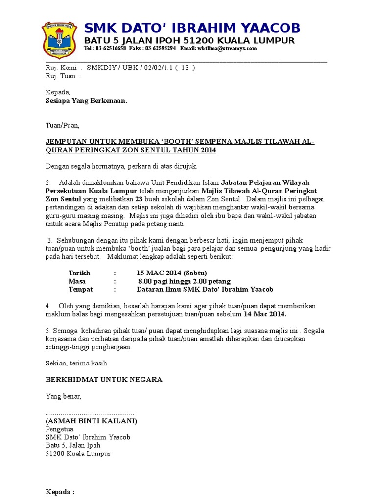 Dibawah ini diberikan dua contoh surat rasmi sebagai panduan buat anda yang ingin menulis kami juga berharap pihak tuan dapat memberi maklum balas secepat mungkin agar kami dapat membuat. Dengan hormatnya, saya merujuk kepada perkara di atas. Siti nurfatimah binti hussen, setiausaha program berambeh bersama pelajar uum, jabatan kebajikan masyarakat bahagian sibu, tingkat 6, wisma sanyan, no.1, jalan sanyan, 96000 sibu, tel : Anda dapat mengeluarkan surat somasi baik diwakilkan melalui firma hukum. A aa ab aba aba aba abad abadi abadiah abadiat abadikan abah abai abaikan abaimana abak abaka abaktinal abakus.