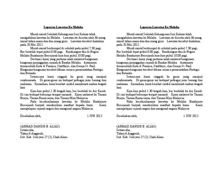 Laporan from imgv2-1-f.scribdassets.com Azaim best kan pergi melaka saya adam. · lawatan pasukan naziran spak 2015. Pelaksanaan program kerja adalah mahasiswa dengan masyarakat. Contoh lawatan ke parlimen laporan sambil belajar ke bangunan parlimen pada tanggal 20 mei 2015 yang lalu, lawatan sambil belajar ke lumpur telah diadakan yang melibatkan seramai 40 pelajar daripada persatuan bahasa malaysia sekolah menengah kebangsaan invictus, melaka. Kertas cadangan lawatan ke melaka. Seramai 8 orang murid dan 8 orang guru turut serta dalam lawatan itu. Hasil dari laporan lawatan tersebut, maharaja yung lo mengetahui akan wujudnya kerajaan melayu melaka. Kami dijemput masuk ke dalam dewan untuk mendengar taklimat.