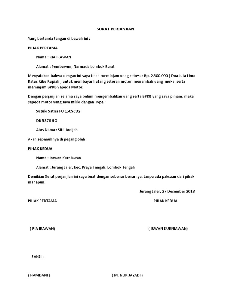 Surat perjanjian hutang piutang dibawah ini bisa anda modifikasi isi dan klausanya sesuai kondisi dan kesepakatan antara pihak yang mengikatkan diri dalam perjanjian hutang perjanjian hutang piutang. Surat perjanjian hutang piutang dibuat serta ditandatangani pihak pertama serta pihak kedua secara sadar serta tanpa adanya paksaan dari. Mengikat terhadap suatu keputusan yang disepakti bersama. Pada bagian isi surat, tulis tentang pihak pembuat pernyataan, isi pernyataan. Menulis surat perjanjian hutang piutang sebenarnya tidaklah terlalu sulit.